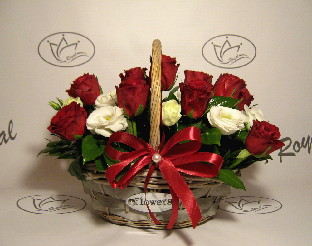 Korpa sa crvenom ružom i lizijantusom.
