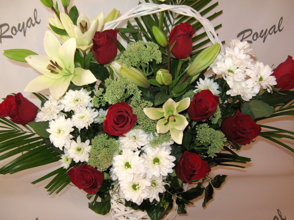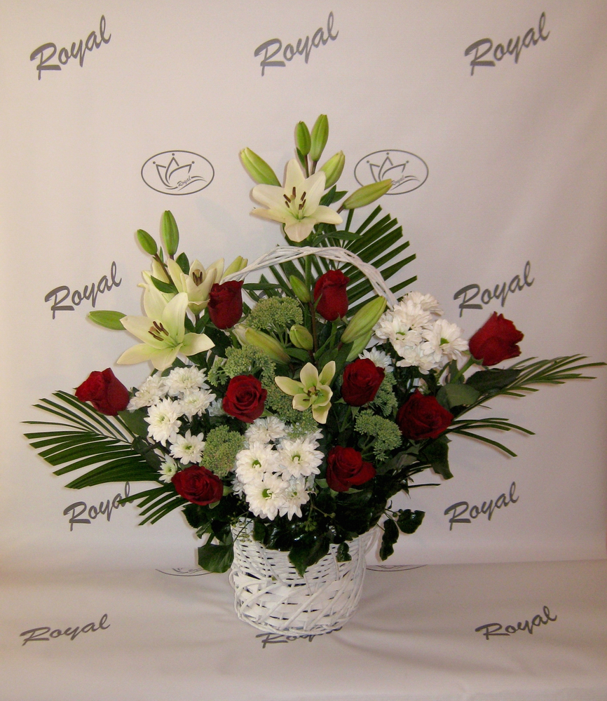 Korpa sa ljiljanom, ružom i hrizantemom.