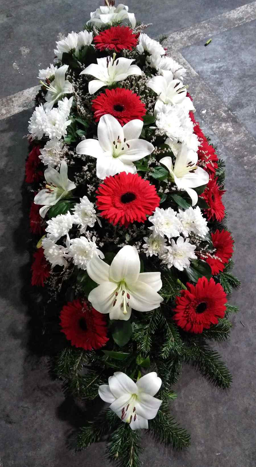 Jedinica mere: komad Suza sa crvenim gerberima, hrizantemama i ljiljanom.