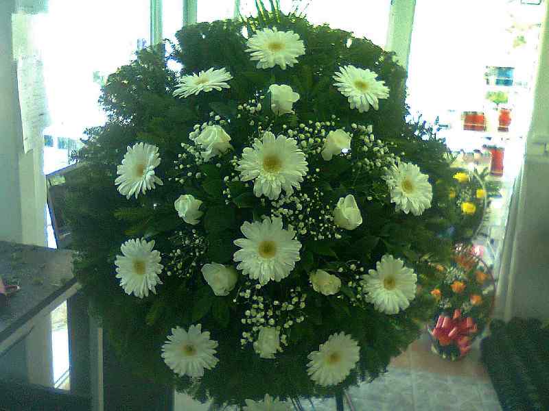 Jedinica mere: komad Venac sa belim ružama, gerberom i gipsofilom.